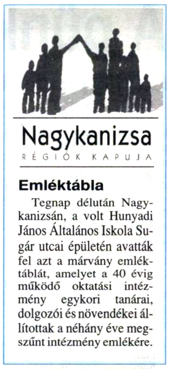 Nyilvános 1242 | 2167 | Zalai Hírlap 2000. június 9. 5. oldal | Emléktábla Tegnap délután Nagykanizsán, a volt Hunyadi János Általános Iskola Sugár utcai épületén avatták fel azt a márvány emléktáblát, amelyet a 40 évig működő oktatási intézmény egykori tanárai, dolgozói és növendékei állítottak a néhány éve megszűnt intézmény emlékére. |