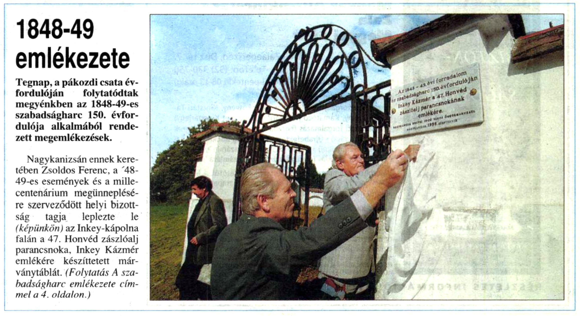Nyilvános 1251 | 1905 | Zalai Hírlap 1998. szeptember 30. 229. szám 1. oldal | 1848-49 emlékezete Tegnap, a pákozdi csata évfordulóján folytatódtak megyénkben az 1848-49-es szabadságharc 150. évfordulója alkalmából rendezett megemlékezések. Nagykanizsán ennek keretében Zsoldos Ferenc, a ''48- 49-es események és a millecentenárium megünneplésére szerveződött helyi bizottság tagja leplezte le (képünkön) az Inkey-kápolna falán a 47. Honvéd zászlóalj parancsnoka, Inkey Kázmér emlékére készíttetett márványtáblát. (Folytatás A szabadságharc emlékezete címmel a 4. oldalon.) |