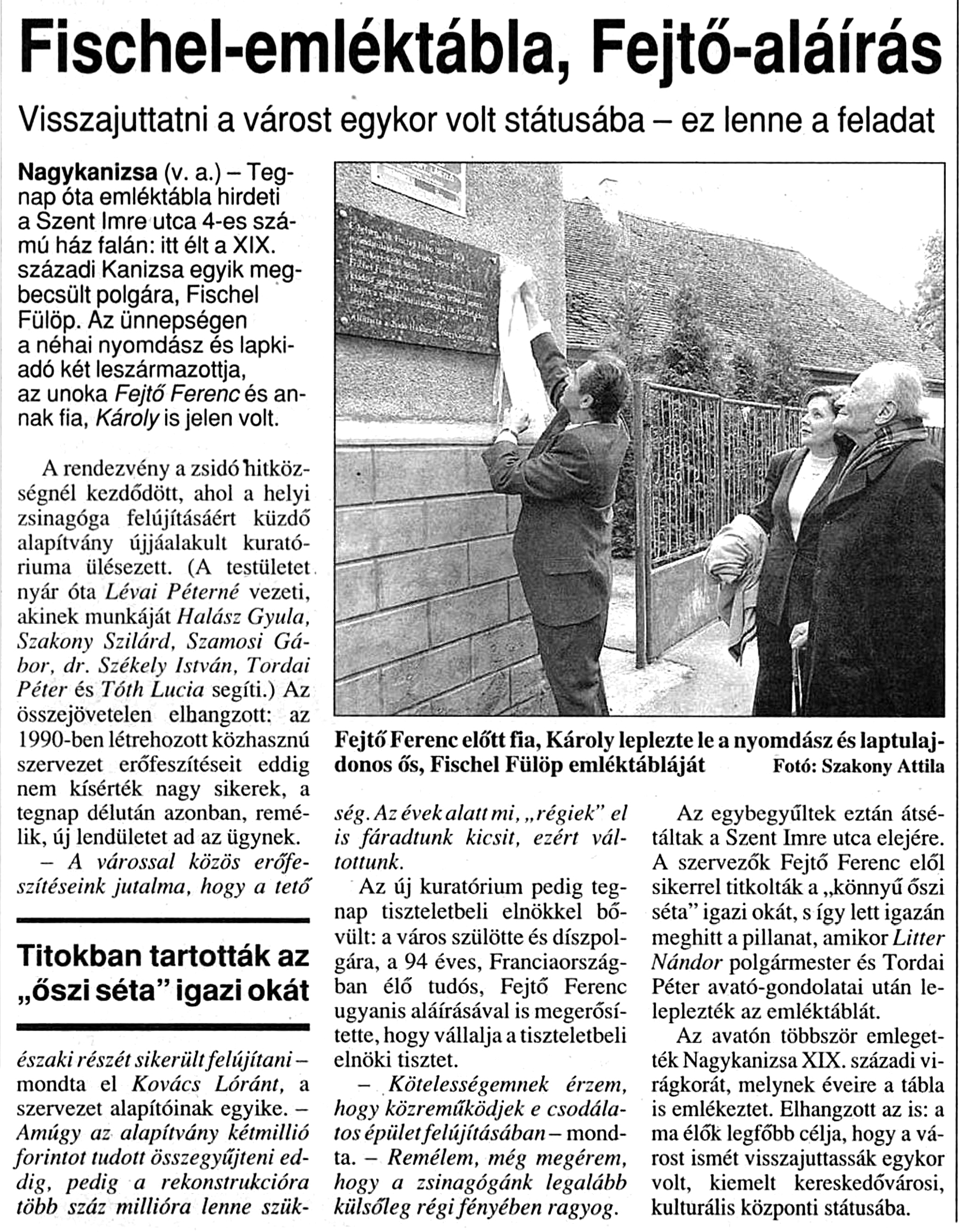 Nyilvános 1030 | 1485 | Zalai Hirlap 2003. október 14. 5. oldal | Fischel-emléktábla, Fejtő-aláírás Visszajuttatni a várost egykor volt státusába - ez lenne a feladat Nagykanizsa (v. a.) - Tegnap óta emléktábla hirdeti a Szent Imre utca 4-es számú ház falán: itt élt a XIX. századi Kanizsa egyik megbecsült polgára, Fischel Fülöp. Az ünnepségen a néhai nyomdász és lapkiadó két leszármazottja, az unoka Fejtő Ferenc és annak fia, Károly is jelen volt. A rendezvény a zsidó hitközségnél kezdődött, ahol a helyi zsinagóga felújításáért küzdő alapítvány újjáalakult kuratóriuma ülésezett. (A testületet nyár óta Lévai Péterné vezeti, akinek munkáját Halász Gyula, Szakony Szilárd, Szamosi Gábor, dr. Székely István, Tordai Péter és Tóth Lucia segíti.) Az összejövetelen elhangzott: az 1990-ben létrehozott közhasznú szervezet erőfeszítéseit eddig nem kísérték nagy sikerek, a tegnap délután azonban, remélik, új lendületet ad az ügynek. - A várossal közös erőfeszítéseink jutalma, hogy a tető északi részét sikerült felújítani - mondta el Kovács Lóránt, a szervezet alapítóinak egyike. - Amúgy az alapítvány kétmillió forintot tudott összegyűjteni eddig, pedig a rekonstrukcióra több száz millióra lenne szükség. Az évek alatt mi, „régiek” el is fáradtunk kicsit, ezért váltottunk. Az új kuratórium pedig tegnap tiszteletbeli elnökkel bővült: a város szülötte és díszpolgára, a 94 éves, Franciaországban élő tudós, Fejtő Ferenc ugyanis aláírásával is megerősítette, hogy vállalja a tiszteletbeli elnöki tisztet. - Kötelességemnek érzem, hogy közreműködjek e csodálatos épület felújításában - mondta. - Remélem, még megérem, hogy a zsinagógánk legalább külsőleg régi fényében ragyog. Az egybegyűltek eztán átsétáltak a Szent Imre utca elejére. A szervezők Fejtő Ferenc elől sikerrel titkolták a„könnyű őszi séta” igazi okát, s így lett igazán meghitt a pillanat, amikor Litter Nándor polgármester és Tordai Péter avató-gondolatai után leleplezték az emléktáblát. Az avatón többször emlegették Nagykanizsa XIX. századi virágkorát, melynek éveire a tábla is emlékeztet. Elhangzott az is: a ma élők legfőbb célja, hogy a várost ismét visszajuttassák egykor volt, kiemelt kereskedővárosi, kulturális központi státusába. Fejtő Ferenc előtt fia, Károly leplezte le a nyomdász és laptulajdonos ős, Fischel Fülöp emléktábláját Fotó: Szakony Attila |