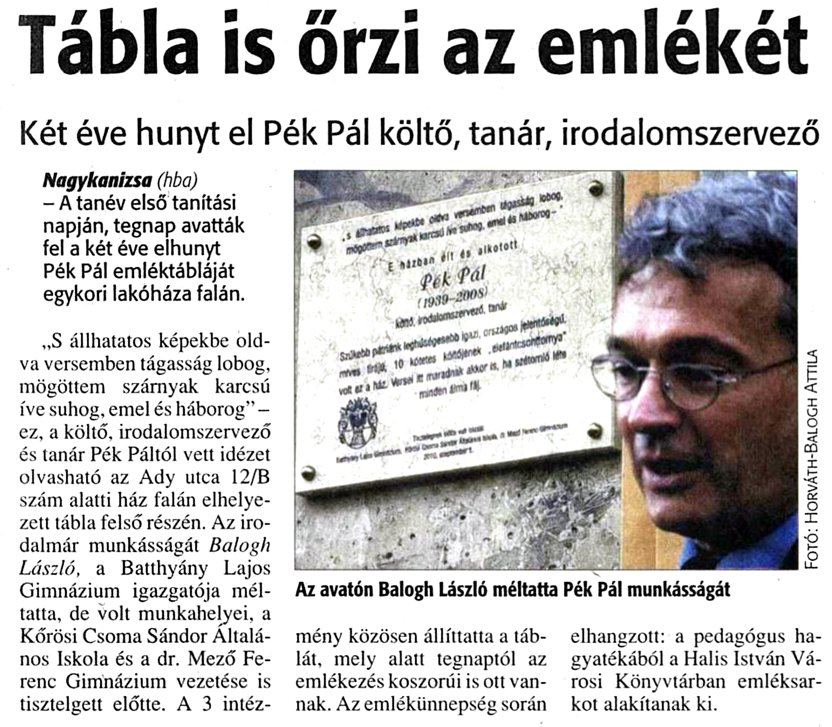 Nyilvános 923 | 1175 | Zalai Hírlap 2010. szeptember 2. 4. oldal | Tábla is őrzi az emlékét Két éve hunyt el Pék Pál költő, tanár, irodalomszervező Nagykanizsa (hba) - A tanév első tanítási napján, tegnap avatták fel a két éve elhunyt Pék Pál emléktábláját egykori lakóháza falán. „S állhatatos képekbe oldva versemben tágasság lobog, mögöttem szárnyak karcsú íve suhog, emel és háborog” - ez, a költő, irodalomszervező és tanár Pék Páltól vett idézet olvasható az Ady utca 12/B szám alatti ház falán elhelyezett tábla felső részén. Az irodalmár munkásságát Balogh László, a Batthyány Lajos Gimnázium igazgatója méltatta, de volt munkahelyei, a Körösi Csorna Sándor Általános Iskola és a dr. Mező Ferenc Gimnázium vezetése is tisztelgett előtte. A 3 intézmény közösen állíttatta a táblát, mely alatt tegnaptól az emlékezés koszorúi is ott vannak. Az emlékünnepség során elhangzott: a pedagógus hagyatékából a Halis István Városi Könyvtárban emléksarkot alakítanak ki. |