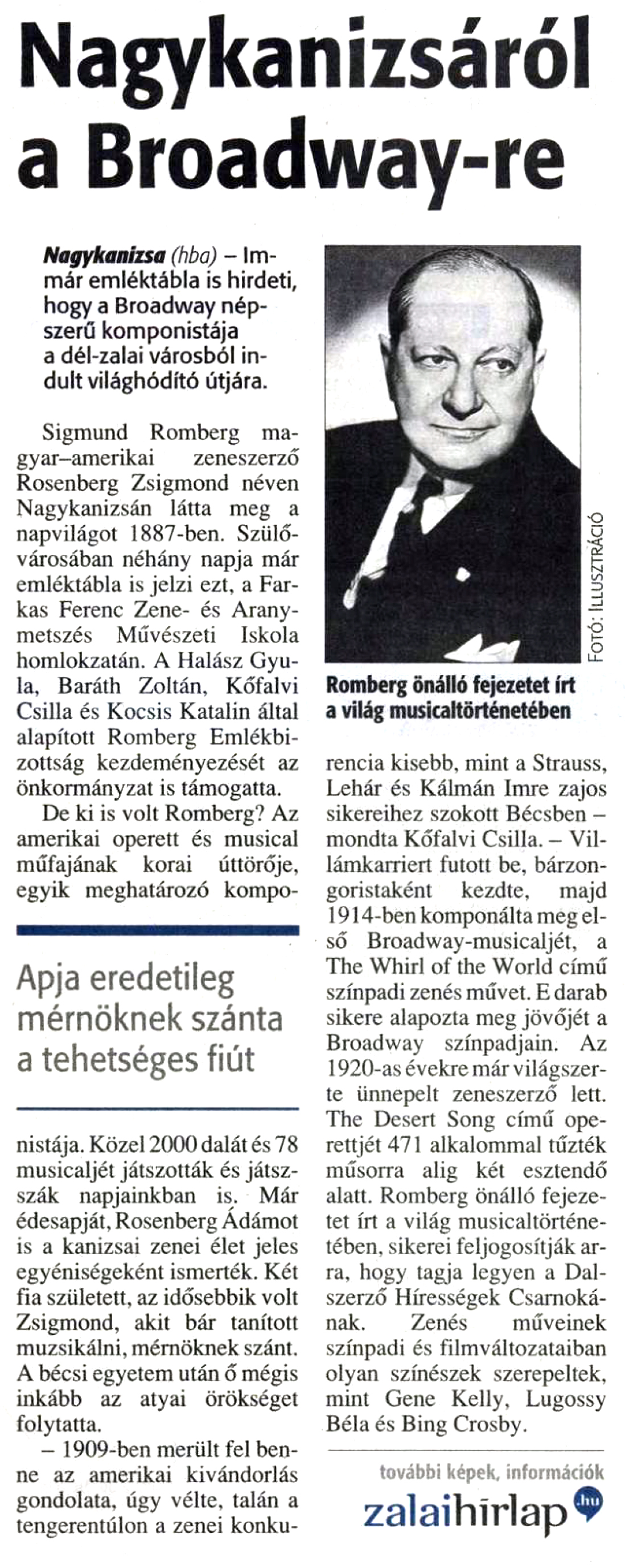 Nyilvános 936 | 1075 | Zalai Hírlap 2010. október 1. 7. oldal | Nagykanizsáról a Broadway-re Nagykanizsa (hba) - Immár emléktábla is hirdeti, hogy a Broadway népszerű komponistája a dél-zalai városból indult világhódító útjára. Sigmund Romberg magyar-amerikai zeneszerző Rosenberg Zsigmond néven Nagykanizsán látta meg a napvilágot 1887-ben. Szülővárosában néhány napja már emléktábla is jelzi ezt, a Farkas Ferenc Zene- és Aranymetszés Művészeti Iskola homlokzatán. A Halász Gyula, Baráth Zoltán, Kőfalvi Csilla és Kocsis Katalin által alapított Romberg Emlékbizottság kezdeményezését az önkormányzat is támogatta. De ki is volt Romberg? Az amerikai operett és musical műfajának korai úttörője, egyik meghatározó komponistája. Közel 2000 dalát és 78 musicaljét játszották és játsszák napjainkban is. Már édesapját, Rosenberg Ádámot is a kanizsai zenei élet jeles egyéniségeként ismerték. Két fia született, az idősebbik volt Zsigmond, akit bár tanított muzsikálni, mérnöknek szánt. A bécsi egyetem után ő mégis inkább az atyai örökséget folytatta. - 1909-ben merült fel benne az amerikai kivándorlás gondolata, úgy vélte, talán a tengerentúlon a zenei konkurencia kisebb, mint a Strauss, Lehár és Kálmán Imre zajos sikereihez szokott Bécsben - mondta Kőfalvi Csilla. - Villámkarriert futott be, bárzongoristaként kezdte, majd 1914-ben komponálta meg első Broadway-musicaljét, a The Whirl of the World című színpadi zenés művet. E darab sikere alapozta meg jövőjét a Broadway színpadjain. Az 1920-as évekre már világszerte ünnepelt zeneszerző lett. The Desert Song című operettjét 471 alkalommal tűzték műsorra alig két esztendő alatt. Romberg önálló fejezetet írt a világ musicaltörténetében, sikerei feljogosítják arra, hogy tagja legyen a Dalszerző Hírességek Csarnokának. Zenés műveinek színpadi és filmváltozataiban olyan színészek szerepeltek, mint Gene Kelly, Lugossy Béla és Bing Crosby. Romberg önálló fejezetet írt a világ musicaltörténetében |
