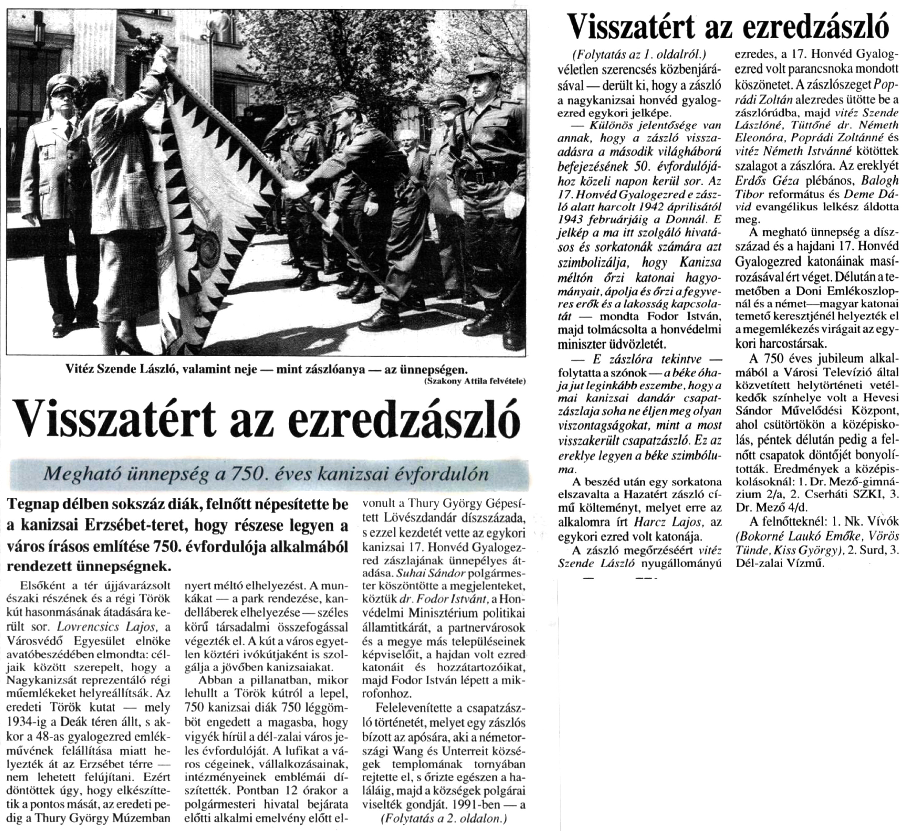 Nyilvános 1143 | 1782 | Rövid leírás | Teljes leírás (4.89 KB) | Zalai Hírlap 1995. április 22. 94. szám 1, 2. oldal Visszatért az ezredzászló Megható ünnepség a 750. éves kanizsai évfordulón Vitéz Szende László, valamint neje — mint zászlóanya — az ünnepségen. (Szakony Attila felvétele) Tegnap délben sokszáz diák, felnőtt népesítette be a kanizsai Erzsébet-teret, hogy részese legyen a város írásos említése 750. évfordulója alkalmából rendezett ünnepségnek. Elsőként a tér újjávarázsolt északi részének és a régi Török kút hasonmásának átadására került sor. Lovrencsics Lajos, a Városvédő Egyesület elnöke avatóbeszédében elmondta: céljaik között szerepelt, hogy a Nagykanizsát reprezentáló régi műemlékeket helyreállítsák. Az eredeti Török kutat — mely 1934-ig a Deák téren állt, s akkor a 48-as gyalogezred emlékművének felállítása miatt helyezték át az Erzsébet térre — nem lehetett felújítani. Ezért döntöttek úgy, hogy elkészíttetik a pontos mását, az eredeti pedig a Thury György Múzemban nyert méltó elhelyezést. A munkákat — a park rendezése, kandeláberek elhelyezése—széles körű társadalmi összefogással végezték el. A kút a város egyetlen köztéri ivókútjaként is szolgálja a jövőben kanizsaiakat. Abban a pillanatban, mikor lehullt a Török kútról a lepel, 750 kanizsai diák 750 léggömböt engedett a magasba, hogy vigyék hírül a dél-zalai város jeles évfordulóját. A lufikat a város cégeinek, vállalkozásainak, intézményeinek emblémái díszítették. Pontban 12 órakor a polgármesteri hivatal bejárata előtti alkalmi emelvény előtt elvonult a Thury György Gépesített Lövészdandár díszszázada, s ezzel kezdetét vette az egykori kanizsai 17. Honvéd Gyalogezred zászlajának ünnepélyes átadása. Suhai Sándor polgármester köszöntötte a megjelenteket, köztük dr. Fodor Istvánt, a Honvédelmi Minisztérium politikai államtitkárát, a partnervárosok és a megye más településeinek képviselőit, a hajdan volt ezred katonáit és hozzátartozóikat, majd Fodor István lépett a mikrofonhoz. Felelevenítette a csapatzászló történetét, melyet egy zászlós bízott az apósára, aki a németországi Wang és Unterreit községek templomának tornyában rejtette el, s őrizte egészen a haláláig, majd a községek polgárai viselték gondját. 1991-ben — a (Folytatás a 2. oldalon.) Visszatért az ezredzászló (Folytatás az 1. oldalról.) véletlen szerencsés közbenjárásával — derült ki, hogy a zászló a nagykanizsai honvéd gyalogezred egykori jelképe. — Különös jelentősége van annak, hogy a zászló visszaadásra a második világháború befejezésének 50. évfordulójához közeli napon kerül sor. Az 17. Honvéd Gyalogezred e zászló alatt harcolt 1942 áprilisától 1943 februárjáig a Donnál. E jelkép a ma itt szolgáló hivatásos és sorkatonák számára azt szimbolizálja, hogy Kanizsa méltón őrzi katonai hagyományait. ápolja és őrzi a fegyveres ereik és a lakosság kapcsolatát — mondta Fodor István, majd tolmácsolta a honvédelmi miniszter üdvözletét. — E zászlóra tekintve — folytatta a szónok — a béke óhaja jut leginkább eszembe, hogy a mai kanizsai dandár csapatzászlaja soha ne éljen meg olyan viszontagságokat, mint a most visszakerült csapatzászló. Ez az ereklye legyen a béke szimbóluma. A beszéd után egy sorkatona elszavalta a Hazatért zászló című költeményt, melyet erre az alkalomra írt Harcz Lajos, az egykori ezred volt katonája. A zászló megőrzéséért vitéz Szende László nyugállományú ezredes, a 17. Honvéd Gyalogezred volt parancsnoka mondott köszönetét. A zászlószeget Poprádi Zoltán alezredes ütötte be a zászlórúdba, majd vitéz Szende Lászlóné, Tüttőné dr. Németh Eleonóra, Poprádi Zoltánné és vitéz Németh Istvánné kötöttek szalagot a zászlóra. Az ereklyét Erdős Géza plébános, Balogh Tibor református és Deme Dávid evangélikus lelkész áldotta meg. A megható ünnepség a díszszázad és a hajdani 17. Honvéd Gyalogezred katonáinak masírozásával ért véget. Délután a temetőben a Doni Emlékoszlopnál és a német—magyar katonai temető keresztjénél helyezték el a megemlékezés virágait az egykori harcostársak. A 750 éves jubileum alkalmából a Városi Televízió által közvetített helytörténeti vetélkedők színhelye volt a Hevesi Sándor Művelődési Központ, ahol csütörtökön a középiskolás, péntek délután pedig a felnőtt csapatok döntőjét bonyolították. Eredmények a középiskolásoknál: 1. Dr. Mező-gimnázium 2/a, 2. Cserháti SZKI, 3. Dr. Mező 4/d. A felnőtteknél: 1. Nk. Vívók (Bokomé Laukó Emőke, Vörös Tünde, Kiss György), 2. Surd, 3. Dél-zalai Vízmű. |